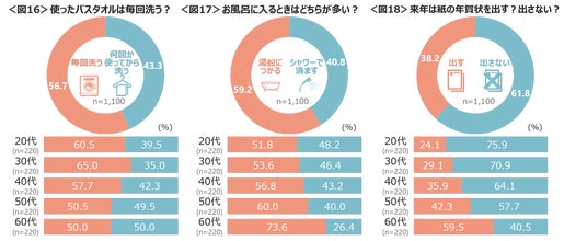 - お風呂は「湯船につかる」が59.2%、「シャワーで済ます」は40.8%。年代が高いほど「湯船につかる」割合が増える。