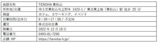 東急不動産が開発し、全国6カ所で展開しているTENOHA各施設については、地域のパートナーの皆さまと連携を図り、地域の資産・資源である既存施設を利活用(リノベーション)し、「人・モノ・サービスが育つ」場所を生み出すことを目指しており、運営連携・相互利用を図りながら地域活性化につなげる施設づくりに取り組んでいます。また、TENOHA東松山については、ソーラーシェアリング(営農型太陽光発電)を中心とした、再生可能エネルギーの実証施設「リエネソーラーファーム東松山」内にある、既存飲食店を利活用した建物です。ソーラーファームの最先端技術の実証提示及び見学説明機能やソーラーシェア下で栽培した作物がその場で味わえるカフェ兼コワーキングスペースを提供致します。