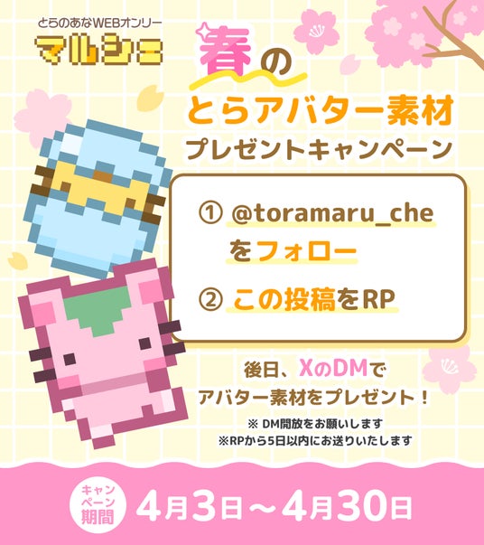4月の開催期間中は、「桜餅」と「たまご」をイメージした【春のとらアバター素材】を全員に差し上げます。
