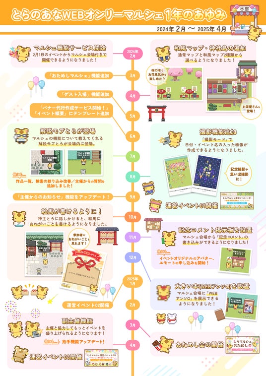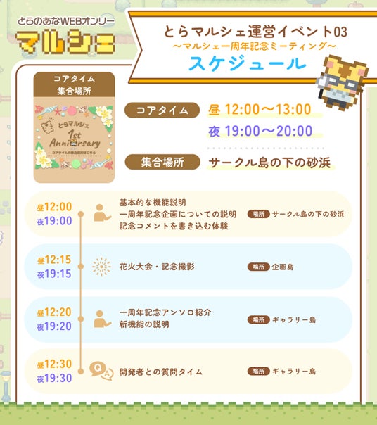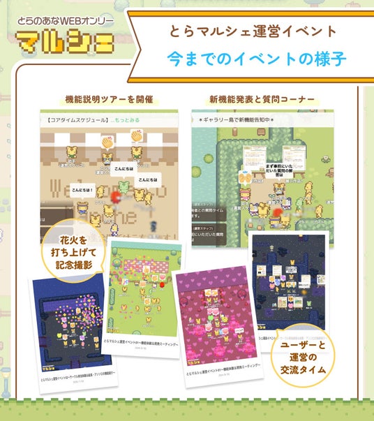 本イベントは「マルシェ機能」を使ってみたい方や興味があるけどまだ参加したことのない方向けの、会員登録無しで気軽にご参加いただけるお試しイベントとなっています。コアタイムには、”マルシェ機能紹介ツアー”や”ユーザーと運営との交流タイム”の開催の他、WEBアンソロジーを使った、”「とらマルシェ」 1年の歩みの振り返り”や”とら図鑑”も展示予定です。皆様のご参加をお待ちしております。