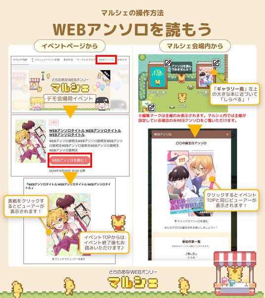 マルシェ会場では作成したアンソロを展示でき、ビューワーが立ち上がりWEBアンソロをその場で読むことができます。