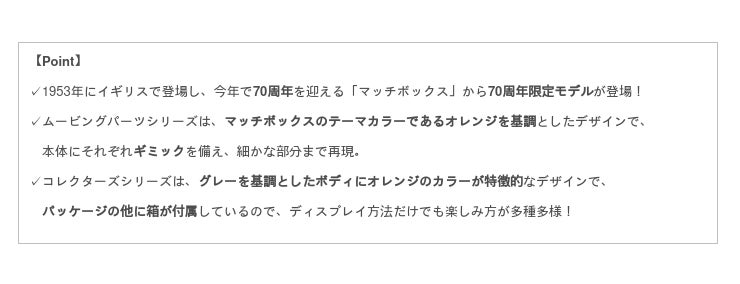 世界大手の玩具メーカー、米国マテル社の日本法人であるマテル・インターナショナル株式会社(本社:東京都千代田区、代表取締役社長:マーク・パンサール)は、マッチボックス70周年を記念した限定モデル、「マッチボックス 70周年ムービングパーツ」「マッチボックス コレクターズ 70周年スペシャルエディション」を6月上旬より発売いたします。