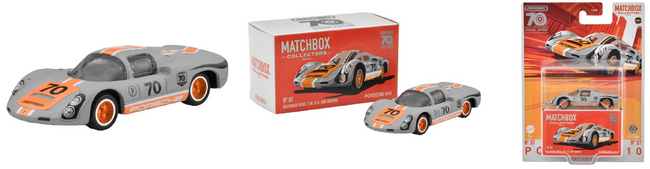 ポルシェ 910は、レース専用車として1967年に発売されました。ポルシェ伝統の空冷式水平対向エンジンを車体中央に搭載しているのが特徴です。1967年の実車の発売からまもなく、英国のレズニー社時代のマッチボックスから製品化されており、70周年をトリビュートする意味合いも込めて今回新金型アイテムとして登場しました。
