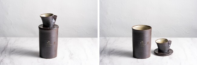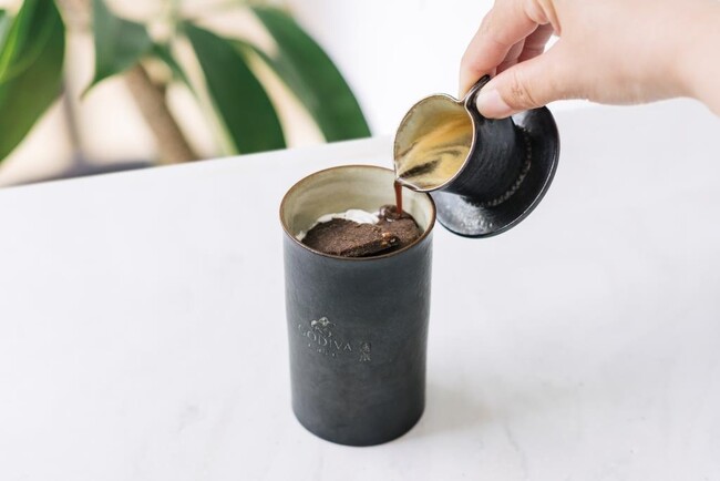 福井県のコラボレーション企画第6弾は、「チョコレートアフォガート そば粉クッキー添え」です。日本六古窯の一つに数えられている越前焼に、GODIVA cafeと越前焼の窯元「国成」のロゴを刻印した、越前焼 国成窯 前田和伸さんオリジナルデザインのドッキング式エスプレッソカップ&タンブラーで提供します。