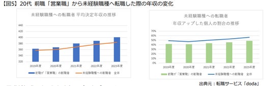 対象:2019年度~2023年度に「doda」エージェントサービスを利用した転職者のうち、「転職回数0回」かつ前職と異なる職種へ転職をした20代のビジネスパーソン