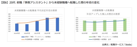 前職が「事務・アシスタント職」だった人のうち、2023年度の、未経験職種への転職が占める割合は約半数でした。また、未経験職種で年収アップした個人の割合は過去5年で10%増加。2023年度においては3人に2人が年収アップをかなえています(図6)。