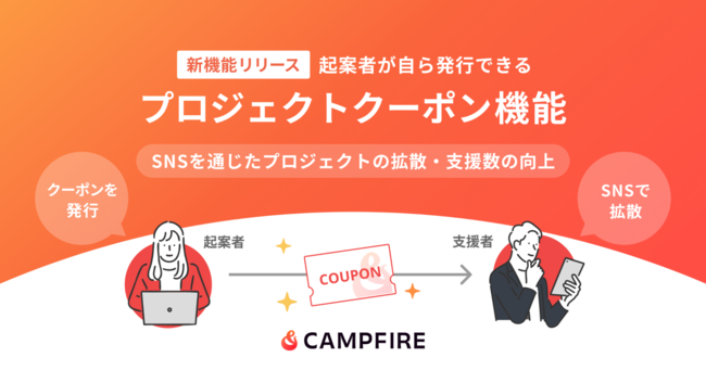 国内最大級のクラウドファンディング「CAMPFIRE」を運営する、株式会社CAMPFIRE( 本社:東京都渋谷区 / 代表取締役:家入一真 / 以下、CAMPFIRE)は、クラウドファンディングの支援が割引になるクーポンをプロジェクトオーナー(起案者)が発行し配布することのできる「プロジェクトクーポン機能」をリリースしました。