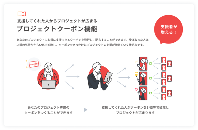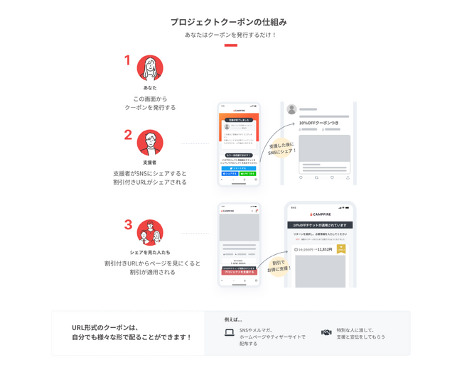 そこでCAMPFIREは、プロジェクトオーナーが手軽により広い支援者層にリーチできる仕組みを作るべく、本機能を開発しました。この機能により発行されるクーポンはURL形式で提供され、プロジェクトオーナーと支援者はSNSなどを通じて簡単にプロジェクトを拡散することが可能です。