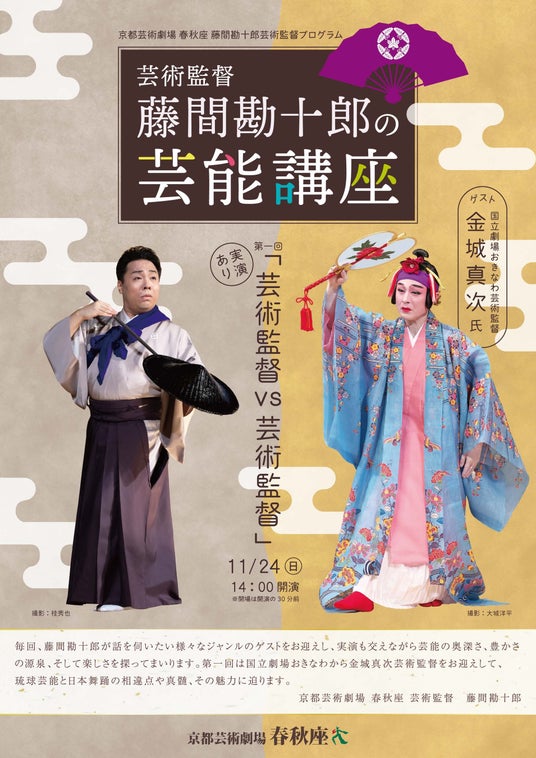 京都芸術大学 舞台芸術研究センターは、京都芸術劇場 春秋座にて2024年11月24日(日)「芸術監督 藤間勘十郎の芸能講座 第一回 芸術監督vs.芸術監督」、2024年12月25日(水)「百華彩鳳 風花に遊ぶ 京都公演」を開催します。両企画を広く周知するために、京都芸術劇場にて記者会見を行いました。