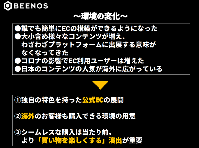 インターネットやSNSの発達によりECの環境は大きく変化し、誰でも簡単にECを開設できるようになりました。海外においてもSNSや動画サービスなどを通じて日本のコンテンツに触れる機会が増え、更に円安の後押しも相まって日本の商品の需要は高まっています。