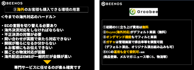 BEENOS Entertainmentは、BEENOSグループの「経験値」「ネットワーク」「データの蓄積」といった3つの強みと新たな「テクノロジー」を駆使し、エンターテインメント産業のデジタルトランスフォーメーション(DX)とグローバル化を支援する事業を行っております。運営するエンターテインメント特化型プラットフォーム「Groobee(https://groobee.com)」ではサイト構築から運営まで一気通貫でサポート、アーティスト・アニメやキャラクター等のコンテンツに特化しており、単独型からモール型でのECサイト展開まで対応が可能です。また、BEENOSグループの事業の一つである海外商品購入サポートサービス「Buyee Connect」との連携もできるため、世界118の国・地域のファンから商品の購入が可能になるなどエンターテインメントに最適な機能が詰まっています。