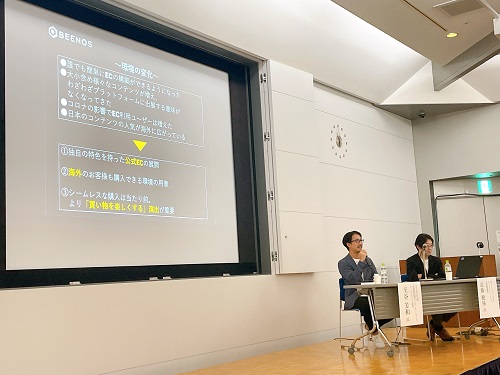 当日は「キャラクター業界における越境EC、オンデマンド越境ECの可能性」と題し、これまでBEENOS Entertainmentが提供してきたエンタメ特化型EC構築サービス「Groobee(グルービー、https://groobee.com/)」やBEENOSグループが展開している海外購入サポートサービス「Buyee Connect」などを通して培った知見から、キャラクター業界におけるEC環境の変化、越境EC展開の仕方や越境ECにおける課題と解決策、および在庫リスクに対応するオンデマンドサービスなど、今後の越境ECの可能性について紹介しました。講演には多数の来場者が訪れ、熱心に耳を傾ける姿が見られました。