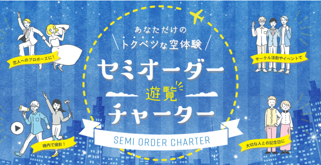 「セミオーダー遊覧チャーター便」は、FDAの小型ジェット旅客機を1機まるごと貸し切ることができるもので、お申込みいただいたお客さま1名でのご利用はもちろん、ご家族やご友人を招待して、最大70名までご搭乗いただけます。そのため、結婚式やパーティー、社員旅行、卒業記念などお客さまの用途に合わせたご利用が可能です。なお、本企画は2022年3月の初実施に続く2回目となります。
