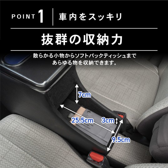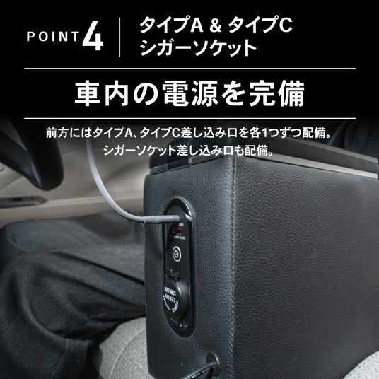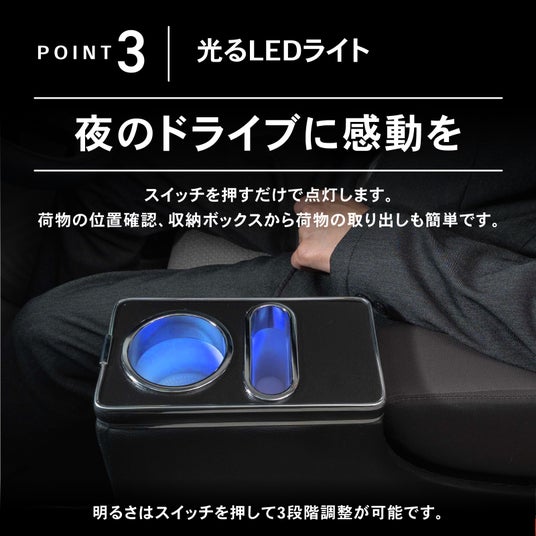 デリカミニ eKスペース ルークス専用LEDアームレスト/コンソールボックス。隙間に入れ込むだけの簡単設置で散らかる小物をすっきり収納。タイプA、タイプCシガーソケットを完備。夜も安心のLED。