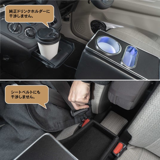 設置はベンチシートの隙間に入れ込むだけ。車内に馴染むデザインで快適空間をすぐにお届けします。純正アームレストはそのまま使用可能です。