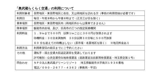 吾野・東吾野両地区の地域活性化を図ることを目的に2014年に発足したNPO法人。吾野、東吾野地区内に鉄道駅はあるものの、鉄道駅から遠い地域が存在し、また、高齢化が進み、商業施設や病院までの移動手段が課題となっていたため、社会資源の活用も視野に入れた新たな移動手段として、2018年、吾野・東吾野地域住民の新たなお出掛けの足として、公共交通空白地有償運送「奥武蔵らくらく交通」の運行を開始しました。前日までに利用者からの予約を受け付け、運転ボランティア所有の自家用車を使用し、吾野・東吾野両地区内等の移動を初乗り500円(2km未満)から、7,700円(25km超~32km、タクシー料金の約35%)で走行し、公共交通機関不足の穴を埋めています。登録番号「埼玉県交第1号」となる事業です。