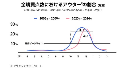 気象庁の観測によると、この20年間で日本の平均気温は約1℃上昇しており、夏日や真夏日の増加により、ファッションの季節感にも変化が起きています。2000年代前半は5~7月に販売ピークを迎えていたTシャツ/カットソーは、2020年代では4~8月に前倒し。販売ピーク期間は平均で約2か月以上拡大するなど、“シーズンレス化”の兆しが見られました。一方で、アウターの販売ピークは、2000年代前半の10月~1月から、2020年代では11月~1月と約1か月間短縮しました。気候変動がファッションの購買行動にも影響を与えていることがうかがえます。