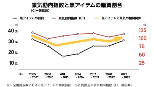 内閣府の景気動向指数(CI一致指数)とZOZOTOWNの購買データを照らし合わせたところ、景気が上向くと「黒」のアイテムが多く購入される傾向が見られました。リーマンショック(2008年)後の景気低迷期以降、景気動向指数の低下にゆるやかに連動し、黒アイテムの販売構成比も31.6%(2005年~2007年)から17.6%(2011年~2013年)まで低下しています。その後、景気回復期(2014~2019年)には、景気動向指数に連動し黒アイテムも26.8%まで上昇。コロナ禍(2020年~)後も再び増加しており、経済の動きとともに“黒を選ぶ人”が増える傾向が見られます。黒は、フォーマルやモードなど、シンプルで落ち着いた印象を与える色で、トレンドに左右されにくい“安心して選べる定番色”として支持されています。景気が好調な時期に黒を選ぶ人が増えるのは、不安ではなく“落ち着いた印象”や“安定感”を求める心理が影響しているのかもしれません。“景気がいいと黒が売れる”という結果は、商品配送に使用する黒色の箱「ZOZO箱」をはじめ、黒をシンボルカラーとするZOZOTOWNにとっても、興味深い結果となりました。