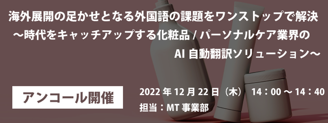 高精度AI自動翻訳の開発・運営を行う株式会社ロゼッタ(本社:東京都千代田区 代表取締役:渡邊 麻呂)は、無料ウェビナー『海外展開の足かせとなる外国語の課題をワンストップで解決 ~時代をキャッチアップする化粧品/パーソナルケア業界のAI自動翻訳ソリューション~』を2022年12月22日(金)に開催いたします。