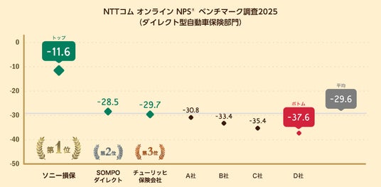 NTTコム オンライン・マーケティング・ソリューション株式会社(本社:東京都品川区、代表取締役社長:稲葉 秀司、以下NTTコム オンライン)は、ダイレクト型自動車保険を対象に、NPSベンチマーク調査2025を実施しました。この結果、最もNPSが高いのは、ソニー損害保険株式会社(以下「ソニー損保」)となりました。
