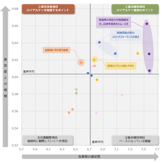 20の項目別に業界全体のロイヤルティの要因を分析したところ、「保険商品の魅力・充実度」や「コストパフォーマンス(補償内容と保険料のバランス)」に加え、「最適なプランの探しやすさ、プランのカスタマイズのしやすさ」がロイヤルティを醸成する要因となりました。また、「事故時の初期対応、事故解決等の対応スピードの速さ・スムーズさ」や「事故発生から保険金のお支払いまでのお客様に寄り添った対応や問題の解決力」、「保険金請求手続き・支払いのスムーズさ」といった事故対応に関する項目もNPS向上に寄与しました。