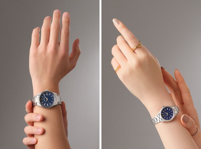 また、2人で見る輝きが永久に続くことを願い、「∞」をイメージした2つの円を、8時位置で重なり合うようレイアウトしました。2つの円にはラメが施されており、落ち着いたブルーのダイヤル上で煌めきます。また、12時のローマ数字と秒針にはゴールドカラーを採用。2人で刻む特別な時間を華やかに彩ります。