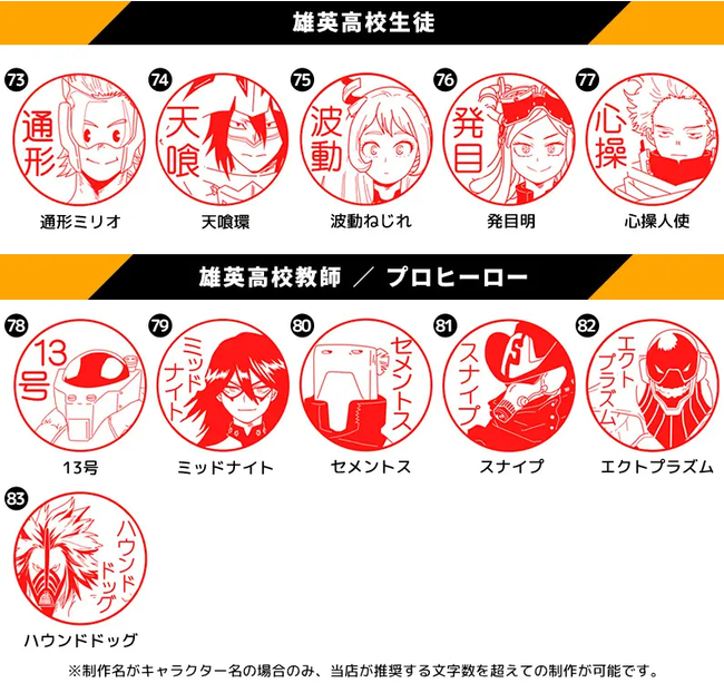 SNSよりリクエストをいただいていたエンデヴァーやホークス、心操人使など34キャラが追加され、総勢106種類に。ヒロアカ好きにはたまらない、実用OKのはんこです。
