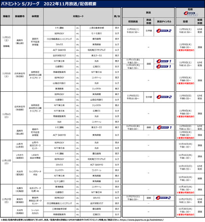 国内最大4チャンネルのスポーツテレビ局、株式会社ジェイ・スポーツ(本社 東京都江東区、代表取締役社長 長谷 一郎、以下「J SPORTS」 ※1)は、11月5日(土)に開幕する国内最高峰のリーグ戦 「バドミントンS/Jリーグ2022」をPC、スマホ、タブレットで見られる動画配信サービス「J SPORTSオンデマンド」 ※2で開幕戦からTOP4トーナメントまで全試合配信します。また注目試合は実況・解説付きで放送します。