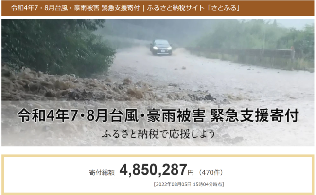ふるさと納税ポータルサイト「さとふる」(https://www.satofull.jp/)を運営する株式会社さとふる(本社:東京都中央区、代表取締役社長:藤井 宏明)は、2022年7月8日に開設した「令和4年7・8月台風・豪雨被害 緊急支援寄付サイト」(https://www.satofull.jp/static/oenkifu/202207_typhoon.php)にて、8月5日より、青森県、山形県、福島県、新潟県、石川県、福井県内7自治体の寄付受け付けを開始します。これにより本サイトで扱う自治体数は27自治体となりました。7月以降に発生した台風・豪雨被害への寄付総額は8月5日午後3時時点で、本サイトを通して約500万円(約500件)となりました。各自治体に集まっている寄付総額などの最新情報は、「令和4年7・8月台風・豪雨被害 緊急支援寄付サイト」に記載しています。