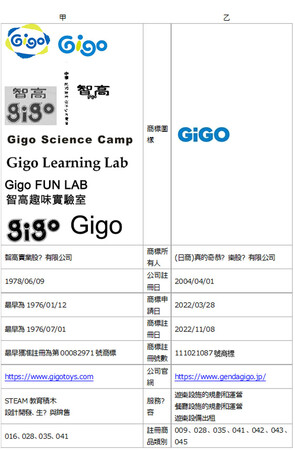 台湾知財局(経済部智慧財産局)登録済商標である『智高實業股份有限公司(以下 甲)』の『Gigo』が類似していますが、当社(以下 乙)は、甲より商標併存の同意を得ております。以下に甲乙のブランド差分表を添付します。