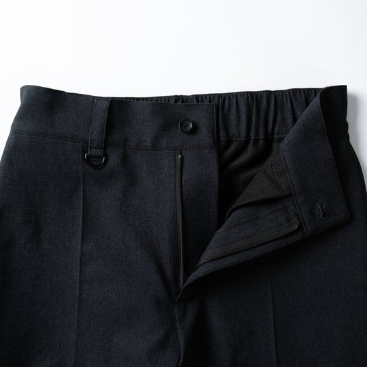 特徴:見た目を損なわない細かな通気孔があいた、高温多湿の夏に適した自社素材「ultimex COOL/アルティメックスクール」を使用。染色にこだわり、深みのあるカラーに仕上げました。高いストレッチ性を持ち、速乾と撥水に優れているので汗によるべたつきを解消し、突然の雨にもしっかり対応いたします。パンツのウエストは両サイドにゴムを内蔵することで、約4cm程度の伸縮性を持たせ、スタイリッシュな見た目と動きやすさを同時に実現。また、お尻周りに裏地を付けることで、下着の透けを防止。センタープレス入りで、脚長効果も期待できるデザイン仕上げました。