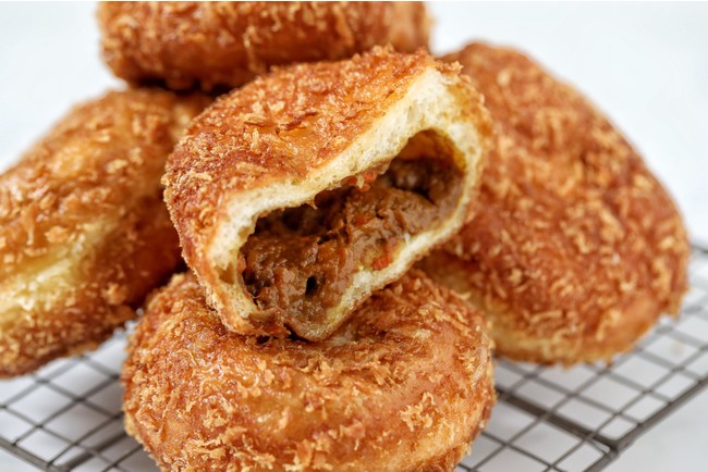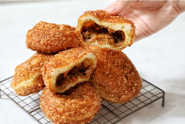 サクサクの衣がついた生地に、ゴロゴロとした具沢山のカレーフィリングを詰めました。牛肉やオニオンが入った甘口のカレーを使用し、どなたでもお召し上がりやすい味わいに仕上げました。
