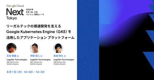 株式会社LegalOn Technologies(本社:東京都渋谷区 代表取締役 執行役員・CEO:角田 望)は、8月1日(木)、2日(金)に パシフィコ横浜ノースで開催される「Google Cloud Next Tokyo ’24」のブレイクアウトセッションに登壇します。セッションでは、SRE(Site Reliability Engineering)の3名がAI法務プラットフォーム「LegalOn Cloud」開発の舞台裏をお話しいたします。