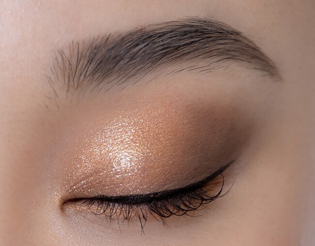 深みのあるマホガニーブラウンを目尻側に、メタリックなコッパーを目頭側につけ、同系色のグラデーションをつくることで大人っぽさと立体感を引き立てます。