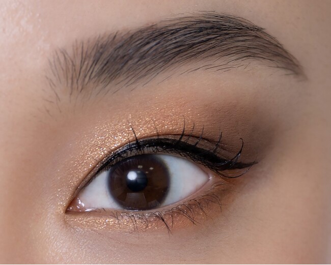 黒のリキッドアイライナーで目尻をキュッとはね上げて描き、力強い目力を演出。