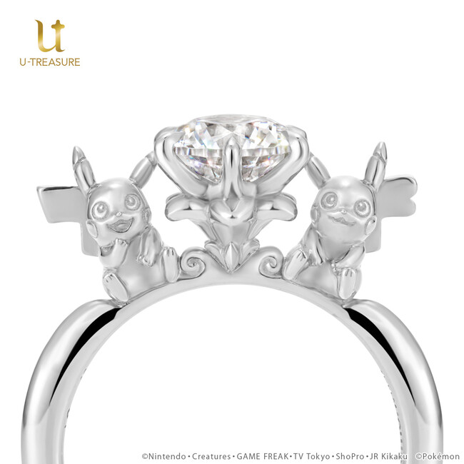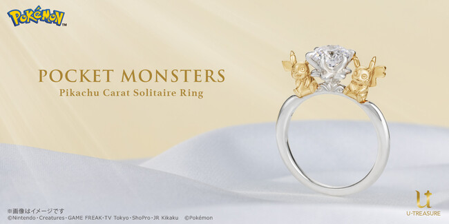 大人のための本格的なキャラクタージュエリーを扱うユートレジャー(東京都豊島区:代表取締役:伊藤 崇史)は、『ポケットモンスター』シリーズのピカチュウをモチーフにした婚約指輪を12月13日(火)に発売します。このたびの新作は、お客様のご要望から、1~1.999ct(カラット)の大粒ダイヤモンドを留めるために開発されたソリティアリング(指輪)です。大粒ダイヤモンドに合わせたサイズで、仲良く寄り添うオスとメスのピカチュウを3Dで表現しました。また、同デザインに直径約6.5mmのキュービックジルコニアを留めたシルバー素材の指輪を、同日から2023年1月31日(火)の期間に予約受付を行ないます。