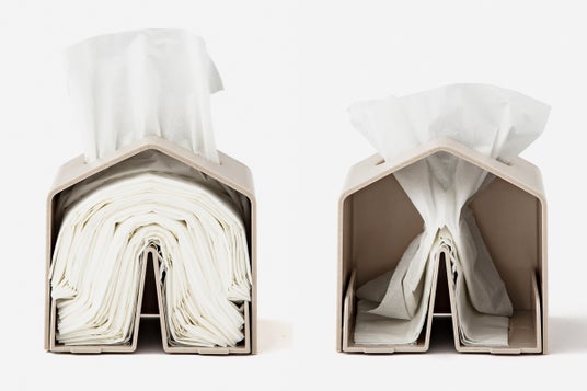 一般的なサイズのティッシュペーパーを箱から出し、二つ折りにして乗せ、上から本体を被せるだけ。