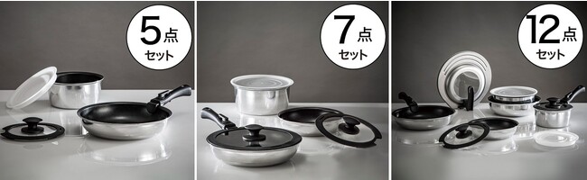 セット品のラインアップは、5点・7点・12点。それぞれ単品でご購入いただくより、お得に揃えていただけます。最もお求めやすい価格のもの、最も軽くてガス火専用のもの、ガス・IHどちらもつかえる超軽量の3種類をご用意しています。