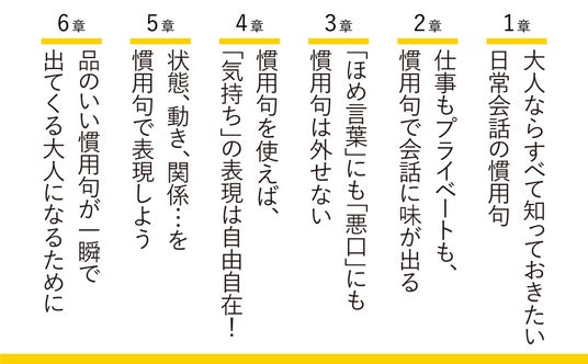 本書は、令和の大人が「会話」で使える慣用句を集めました。まさしく今、日々の会話やビジネストークをより豊かに、そしてより人の興味を惹くものにする、実践的な慣用句の本です。