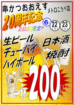 串かつ おおえす メトロこうべ店の開店20周年記念を記念して、6/22(月)・23(火)の2日間に限り、生ビール・チューハイ・ハイボール・日本酒・焼酎を一杯200円にてご提供させていただきます。
