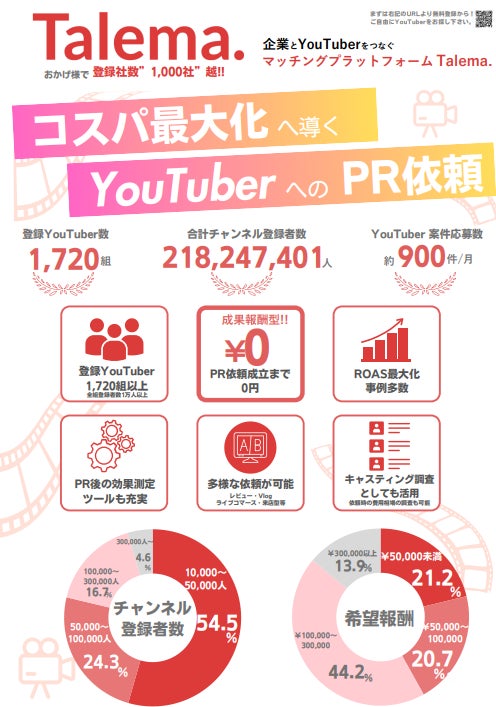 Talema.(タレマ)は、【チャンネル登録者数が1万人以上のYouTuber】と【動画で商品サービスを宣伝したい企業】を直接つなぐマッチングプラットフォームです。1,700組以上*²のYouTuberが登録しており、コスメ・日用品・旅行などの幅広い案件が掲載されています。