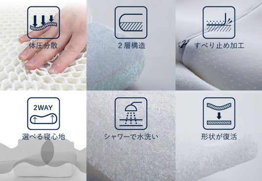 また、枕カバーの裏側に配置された立体形状のジェル素材が、身体の動きに合わせて変形することで枕の中の空気を循環させ、熱や湿気を逃がします。