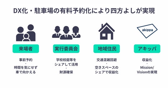 今年は昨年に比べ予約可能な台数が若干増えるものの、公式駐車場のスペースには限りがあります。そこでアキッパでは、周辺の民間企業や、空きスペースをお持ちの個人の方にも広く駐車場の貸し出しを推進し、当日利用可能なスペースの確保をすすめていきます。