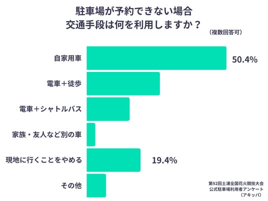 ご利用者さまの満足度は高かった一方で、昨年は予約できる駐車場の不足が課題となりました。アンケートでは、もし駐車場が予約できなかった場合にどのような交通手段を利用するか尋ねたところ「自家用車」が半数以上を占め、およそ2割は「現地に行くことをやめる」と回答しました。高齢で足が悪い、小さな子供がいて混雑を避けたい、など公共交通機関やシャトルバスの準備があっても自家用車での需要は一定数あることがわかりました。