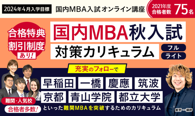 早稲田、一橋、慶應、筑波、京都、青山学院、都立大学といった難関MBAを突破するためのカリキュラムです。