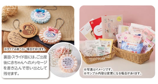 また、出産予定日をご登録いただいたお客さまには、出産育児に役立つサンプル&マタニティマークキーホルダーをプレゼントいたします。