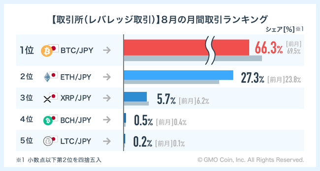 「取引所(レバレッジ取引)」では、ビットコイン(BTC)/JPYがシェア66.3%で1位となりました。