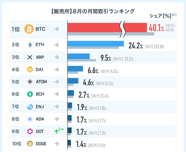 前月7月の取引ランキングと比較すると、上位銘柄ではビットコイン(BTC)、リップル(XRP)がシェアを下げ、イーサリアム(ETH)、ダイ(DAI)、コスモス(ATOM)がシェアを伸ばしました。