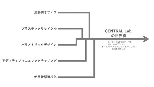 オフィスに対する価値観が大きく変化する今日、オフィスづくりとオフィス家具づくりを生業とする当社はオフィスが抱える本質的な課題に向き合う存在でありたいと思います。新技術・新素材・新しいユーザー体験をオフィスの文脈に応用することが当研究所の姿勢です。完成と浸透には時間を要する課題もありますが、発足と同時にスタートすることができました。今後も「CENTRAL Lab.の世界線」が実現するまでの過程を発信していきますのでぜひご注目ください。