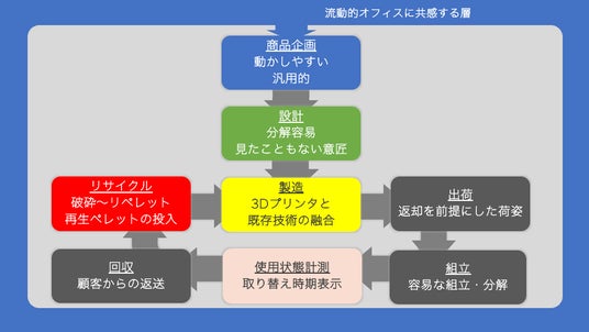 具体的には、より柔軟に変化するオフィスに対応するため、コンピューターによるデザインと3Dプリンターを駆使して数に頼らない生産を実現します。また、プラスチックパーツは使用状態を可視化することで短いサイクルで回収し、独自のリサイクル手法を確立してプラスチックごみ問題に貢献します。